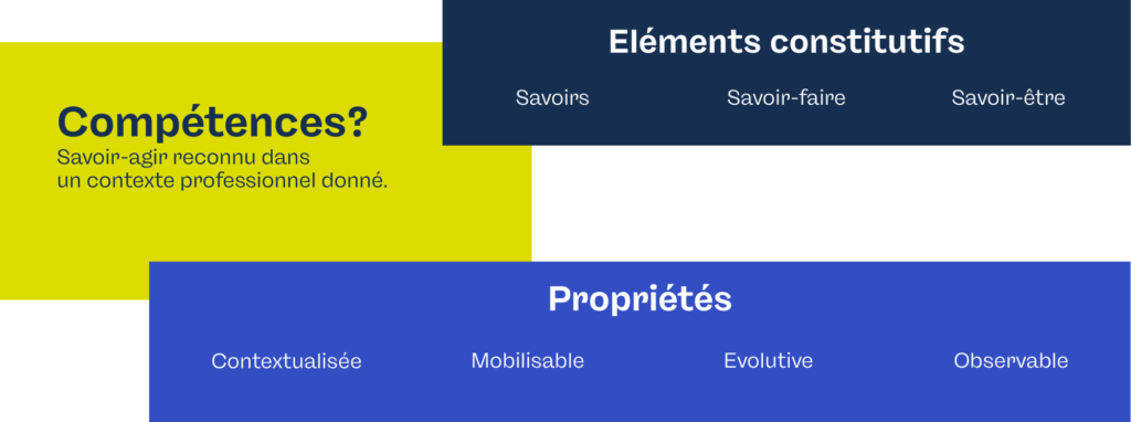 Une compétence est un savoir-agir reconnu dans un contexte professionnel donné, résultant de la mobilisation et de la combinaison de trois composantes principales :