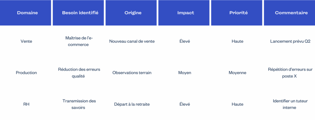 Exemple: Dans l’équipe IT d’une entreprise moyenne, une réunion d’équipe a permis d’identifier un besoin partagé en gestion de projet agile, jusque-là passé inaperçu par la direction.
