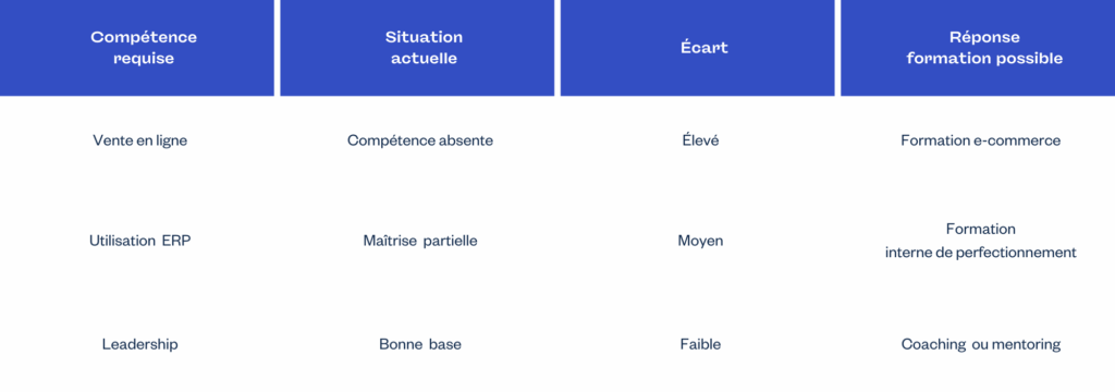 Pour passer du constat à l’action, mesurez l’écart entre les compétences existantes et celles dont vous avez besoin. Cela peut se faire simplement avec cet aperçu :